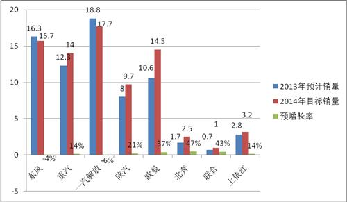 各企業(yè)2013年銷量和2014年目標(biāo)對比(單位:萬輛)