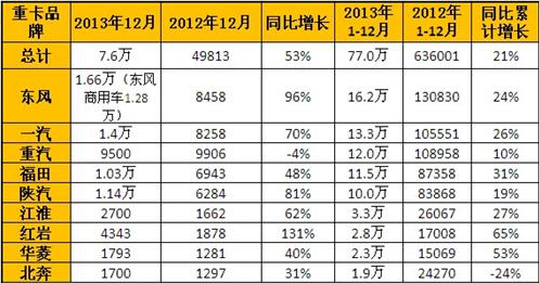 2013年12月的重卡市場銷量,已經在很多人的意料之中。由于國四因素“作祟”,大多數重卡企業要么在12月開足馬力生產國三車,要么在12月一邊生產一邊提前開出發票給經銷商,其結果就是,12月份的重卡市場以7.6萬輛的銷量收官,同比大幅增長53%,環比11月也有15%的增長率。