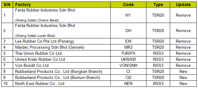 被移出TSR20合約認(rèn)證工廠名單的為FELDA的HY和DH,Lee Rubber的EM,Mardec的MR3。