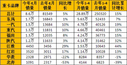 具體而言,1-4月,東風以累計5.63萬輛和7%的同比增幅,繼續領銜行業;一汽和重汽分別銷售4.78萬輛(同比增長19%)和4.66萬輛(增幅15%),緊隨東風之后。福田和陜汽分別銷售重卡4.24萬輛和4.14萬輛,增幅為15%和32%。第六名江淮累計銷車1.53萬輛,同比增長44%,累計增幅為行業第一;紅巖累計銷車1.14萬輛,同比增長13%。華菱和北奔1-4月分別銷售重卡8284輛和4144輛,同比下降1%和39%。