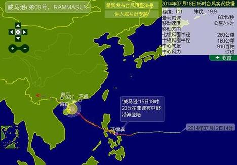 7月18日15時30分前后,“威馬遜”以超強臺風的“身份”在海南省文昌市翁田鎮沿海登陸,登陸時中心附近最大風力為17級(60米/秒),中心最低氣壓為910百帕。“威馬遜”不遜,名副其實地成為1973年以來登陸華南的最強臺風。