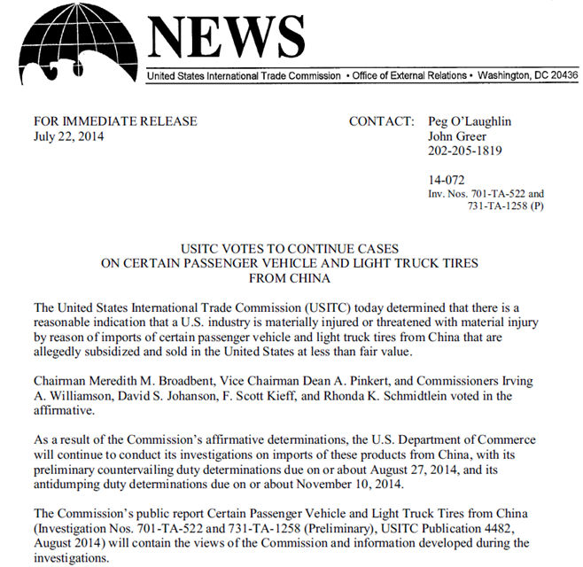 于2014年7月22日,美國國際貿易委員會決定從中國進口的轎車和輕卡輪胎可能會或可能很快會“實質性”損害美國國內輪胎行業。