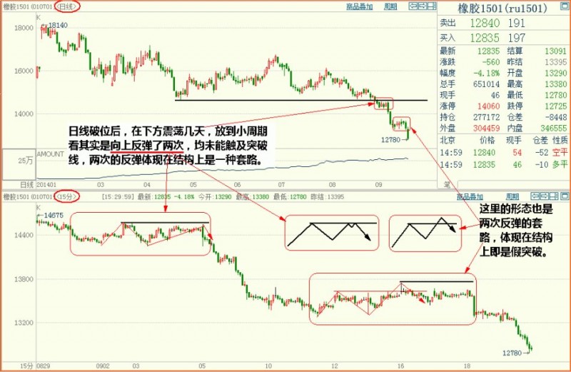 這兩次的反彈都是標準《戰·期貨》一書中的結構圖,結構圖上將反彈定義了一次、兩次、三次,多數情況下都是以兩次來結束,極限的情況也只有三次,這樣的結構可以很好地避免因形態看起來不那么完美而造成的困擾。
