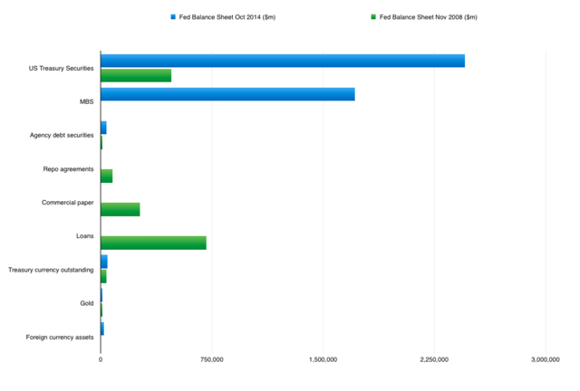 美聯儲資產負債表規模從2008年9月時候的9000億美元膨脹到了2014年10月時候的4.5萬億美元:
