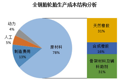 上圖看出,全鋼胎生產成本結構中,原材料費用占比最大,約占總成本的78%;而在原材料中橡膠原材料占比最大,約占總成本的47%,其中天然橡膠以其優越的綜合性能占據生產成本的最大的比例,約占總成本的31%;其次是合成橡膠,約占總成本的16%;骨架材料及輔料助劑約占總成本的31%。其他成本費用中,制造費用占到總成本的13%,人工費用占到總成本的5%,動力費用約占4%。可以看出,橡膠原材料成本占據整個輪胎生產成本的“半壁江山”。