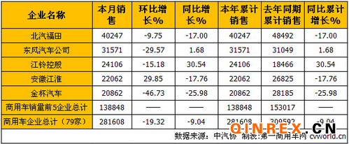 環比上月,銷量前五企業僅有安徽江淮( 29.85%)一家實現增長,其他4家企業均有不小下滑;與去年同期相比,也只有東風汽車公司( 1.68%)和江鈴控股( 30.54%)兩家企業實現正增長。
