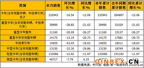 由上表可見,卡車市場所有細分 車型1月份銷量環比上月全部出現下滑,下滑最嚴重的是半掛牽引車(-43.45%)。與去年1月份相比,卡車市場仍然表現慘淡,除微型卡車(含非完整車 輛)實現6.33%的增幅外,其他細分市場全部下滑,中型卡車(含非完整車輛)以-32.30%的降幅成為最差細分市場。