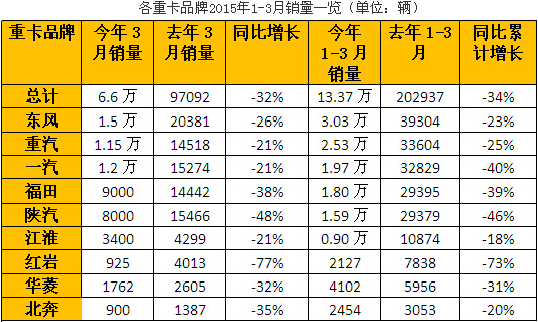怎么形容都不為過。第一商用車網最新獲悉,重卡市場3月份共計銷售各類車輛6.6萬輛,比去年同期的9.7萬 輛大幅下降32%,而且,這個數字還不到過去六年(2009-2014年)3月份銷量的平均值(96558輛),市場下滑之慘烈程度,也許只有2012年 能與之相比。由于1、2月份的市場也很不理想,因此,重卡市場2015年一季度只銷售了13.37萬輛,同比下降34%。