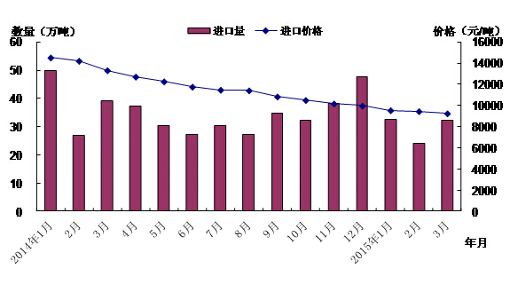 2014年1月~2015年3月我國(guó)橡膠進(jìn)口量?jī)r(jià)月度走勢(shì)圖