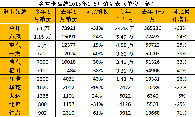 累計來看,1-5月,國內(nèi)重卡市場累計銷售24.43萬輛,同比下滑33%。其中, 東風(fēng)仍然以5.49萬輛(降幅24%)穩(wěn)居第一;中國重汽居第二,1-5月累計銷售重卡4.55萬輛,同比下降25%。第三名一汽銷售重卡3.60萬輛, 同比下降39%,超過行業(yè)平均降幅6個百分點;第四名陜汽和第五名福田銷售重卡3.41萬和3.21萬輛,同比下降33%和41%。第六名江淮重卡銷售 1.43萬輛,同比下降26%;華菱星馬銷車7472輛,同比下降27%;大運重卡累計銷售6022輛,同比小幅下降5%;北奔和紅巖銷售重卡4126輛 和3912輛,分別下降25%和71%。(第一商用車網(wǎng))