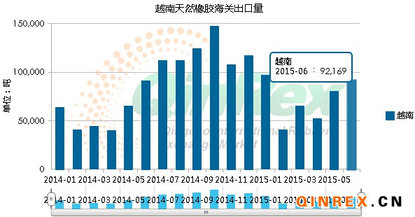 QinRex據越南7月15日消息,越南海關最新公布的數據顯示,越南2015年6月橡膠出口量為92,169噸,較5月增加14.5%。