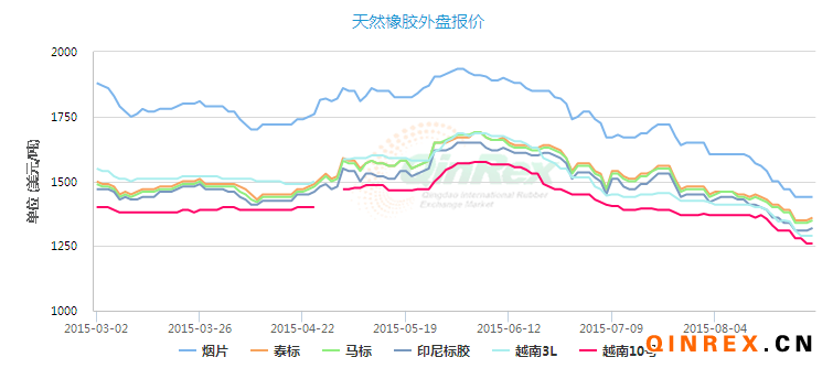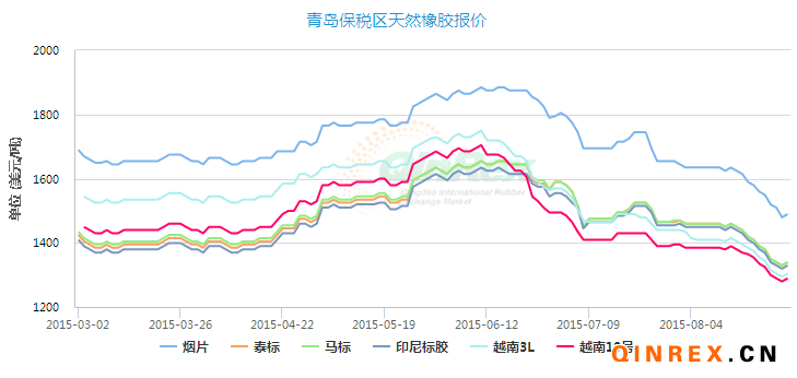 本周青島保稅區天然橡膠現貨美金價格繼續走低,小幅整理,受金融市場大跌影響,橡膠期貨價格周內大跌,拖累現貨價格周初大幅走低,現貨市場報價積極性一般,整體交投氣氛不佳。復合膠貨源不多,受新規影響進口量大幅萎縮。