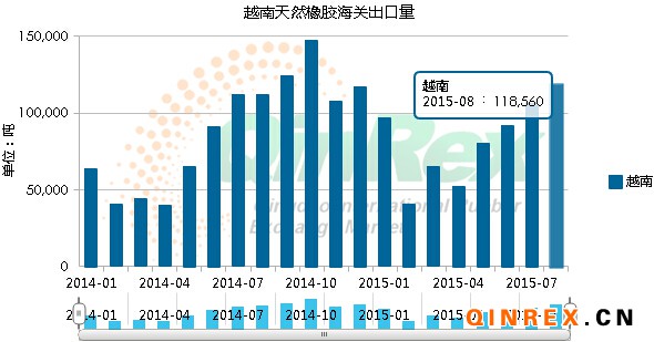 QinRex據越南9月16日消息,越南海關最新公布的數據顯示,越南2015年8月橡膠出口量為118,560噸,較7月增加11.4%,同比增5.8%。
