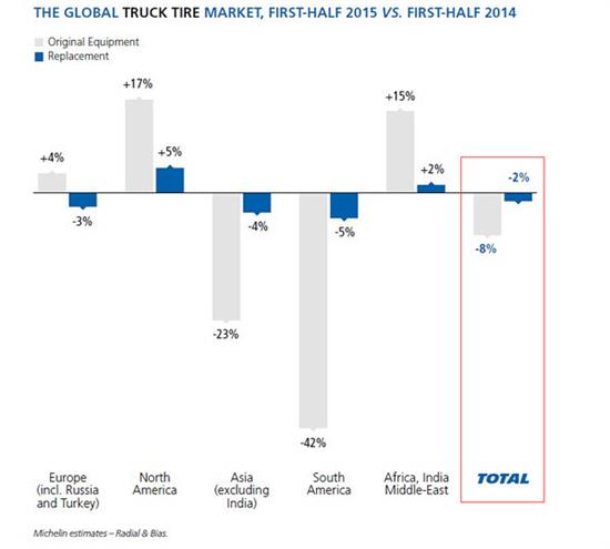 2015年上半年,米其林轎車胎和輕卡輪胎,在北美、中國、西歐市場穩(wěn)步提升,而在東歐、巴西和泰國,卻有微弱下滑。而在重卡市場,斜交胎和子午線輪在第一季度和第二季度呈下滑態(tài)勢。