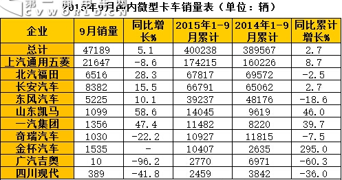 2015年9月,國內(nèi)微型卡車(含非完整車輛)產(chǎn)量為46706輛,同比增長9.1%;1-9月的累計產(chǎn)量為384826輛,累計微增0.05%。(第一商用車網(wǎng))