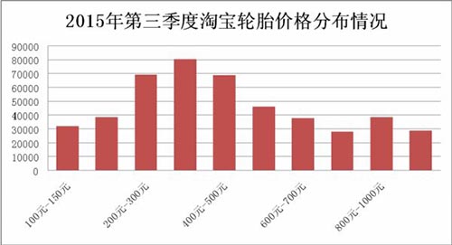 2015年第三季度,線上輪胎的銷售價格基本維持不變,從150元到1500元不等,而200-500元的輪胎價格區間依舊最受消費者歡迎,相較于以往各月份變化不大。三季度,300-400元的輪胎成交量已突破80000條大關。由此看出,平民化的價格仍然最受消費者歡迎。