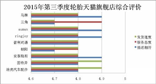 據統計,目前,進駐天貓旗艦店的輪胎品牌增至13家。從現有數據來看,無論是產品描述相符程度,還是商家發貨速度和服務態度,各家輪胎品牌旗艦店的分數均維持在中等水平。此外,從消費者的打分和評價方面可以看出,目前,商家的描述相符和服務態度的滿意度普遍較低,商家仍需在這兩方面多下功夫。