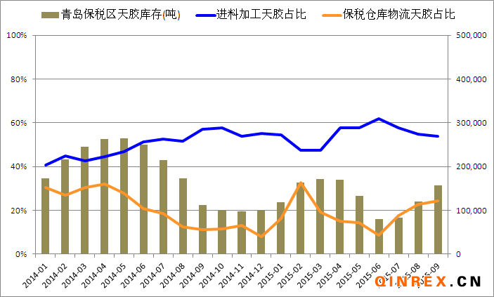 通常情況下,進料加工橡膠和保稅區倉儲橡膠是此消彼長的關系。雖然近幾個月也是這種關系,但當兩者同時放量,尤其后者增量較多時,就會打破這種平衡,導致貨源充足,從而促進庫存增加。這從今年7月份開始至今的青島保稅區橡膠庫存可以直觀地看到。