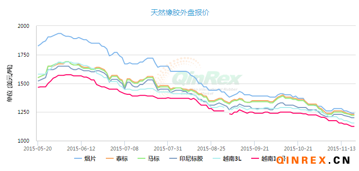 本周天然橡膠青島保稅區現貨報價震蕩走低,市場交投氣氛低迷,貿易商多觀望,采購意愿較低。
