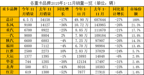 累計來看,1-11月,重卡市場累計銷售49.9萬輛,同比下滑27%,雖然降幅有一點點的縮窄,但仍在-25%以上。東風仍然是老大,1-11月累計銷售 重卡10.72萬輛,同比下降26%,跟行業平均水平相當,市場份額為21.5%;中國重汽累計銷車8.85萬輛,同比下降21%,低于行業整體降幅,市 場份額升至17.7%;第三名為一汽集團,累計銷售重卡7.9萬輛,同比下滑28%,降幅也接近行業平均水平,市場份額為15.8%。