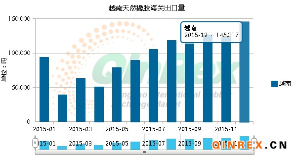 QinRex據(jù)越南1月18日消息,越南海關(guān)最新公布的數(shù)據(jù)顯示,越南2015年12月橡膠出口量為145,317噸,同比增23.8%,環(huán)比增18.1%。