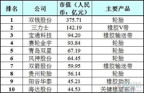 以下是中國橡膠業(yè)上市公司市值十強榜單: