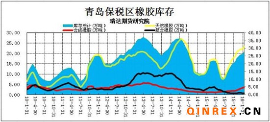 由于春節期間保稅區到貨集中,截至2月中旬青島保稅區橡膠庫存繼續上漲至27.81萬噸,較1月底的26.18萬噸增加1.63萬噸,漲幅6.23%,同比增長65%。具體庫存品種來看,均有不同程度增加,但新增庫存主要來自天然膠,不過,混合膠庫存增量相對較多。伴隨著庫存的增加,青島保稅區庫容逐漸飽和。交割品方面,可流通15年國營全乳膠基本悉數流入交割庫,中長期來看,產業資金巨量套保盤仍將施壓后期滬膠市場。而目前,高庫存成為天膠市場博弈的焦點,在國內顯性庫存已經突破50萬噸的大背景下,混合膠進口總量預計不減,后市庫存對天膠走勢的壓力有增無減。
