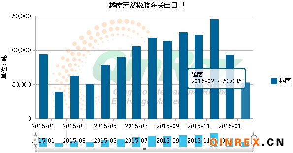 QinRex據越南3月14日消息,越南海關最新公布的數據顯示,越南2016年2月橡膠出口量為52,035噸,同比增33%,環比降44.1%。