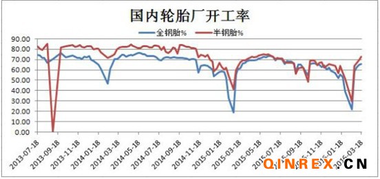 近期全鋼胎內(nèi)銷、出口均表現(xiàn)良好。年后物流需求改善,經(jīng)銷商回補庫存,終端處于陸續(xù)消化中;而出口訂單也明顯增多,雙反仍在調(diào)查中稅率亦未確定,國外代理商積極采購儲備一定庫存,訂單持續(xù)釋放。在市場需求恢復(fù)、價格政策及出口訂單的推動下,輪胎廠開工整體走高。全鋼普遍在7成以上,部分廠家開工繼續(xù)提漲,開工率可至八成。但隨著經(jīng)銷商訂單進(jìn)入消化期,開工仍有可能再度受到影響,廠家開工或在二季度進(jìn)入溫和震蕩趨勢。