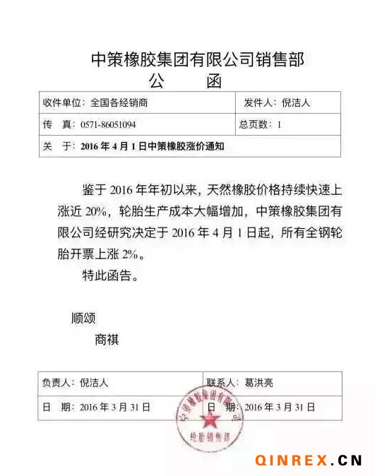 自2016年年初以來,天膠價格持續快速上漲,輪胎生產成本大幅增加。3月31日,中策橡膠集團有限公司銷售部發布公函,自4月1日起對本公司所產全鋼胎進行漲價。