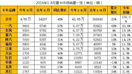 最近的重卡市場(chǎng),真是沒(méi)有做不到,只有想不到。就在2016年8月這個(gè)傳統(tǒng)的“銷售淡季”,國(guó)內(nèi)重卡市場(chǎng)共約銷售各類車輛4.95萬(wàn)輛,比去年同期的3.42萬(wàn)輛大幅增長(zhǎng)45%。這個(gè)同比增幅,也創(chuàng)下了今年以來(lái)月度增幅的最高值。