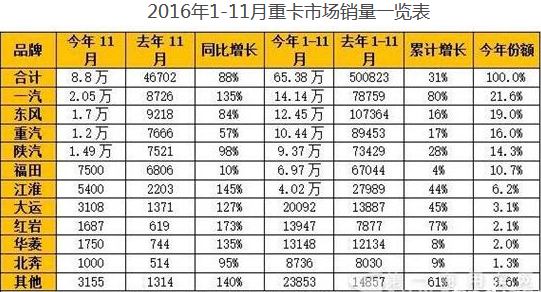 就在剛剛過(guò)去的11月,各重卡廠家卯足了勁生產(chǎn),也沒(méi)能完全滿(mǎn)足終端市場(chǎng)的旺盛購(gòu)車(chē)需求。不過(guò),11月份8.8萬(wàn)輛的銷(xiāo)售量,已經(jīng)創(chuàng)下了中國(guó)重卡史上的歷史新高。在此之前,11月重卡市場(chǎng)的歷史高點(diǎn)是在2010年11月,當(dāng)時(shí)的月銷(xiāo)量是8.08萬(wàn)輛。