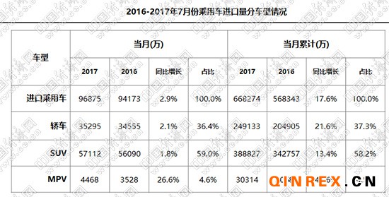 7月,乘用車共進口9.7萬輛,同比增長2.9%。從車型結構來看,7月份三大類車型均有所增長。其中,MPV同比增長26.6%,轎車同比增長2.1%,SUV僅增長1.8%,但是依舊占進口車總量的近6成左右。另外,SUV終端銷量呈小幅下滑態(tài)勢。王存表示,SUV銷量下滑主要是國產(chǎn)化帶來的影響,因為SUV銷量達到一定的規(guī)模之后就有國產(chǎn)化的要求,這就導致其進口量的減少,所以銷量下降。