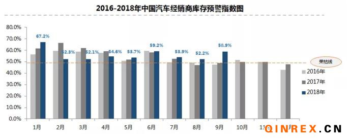 結合此前數據,2018年1月至9月,單月汽車經銷商庫存預警指數雖有所變化,但均處于警戒線之上,經銷商整體經營狀況欠佳。另值得注意的是,在2016以及2017年,經銷商庫存指數在8月份均退至警戒線以下,并在接下來的幾個月中保持這一表現,而2018年情況似乎不容樂觀,該指數不僅未能在8月份降至警戒線之下,還在9月份再度上升,可見經銷商仍然面臨著較大的庫存壓力,加之車市下行,部分經銷商經營風險增大。