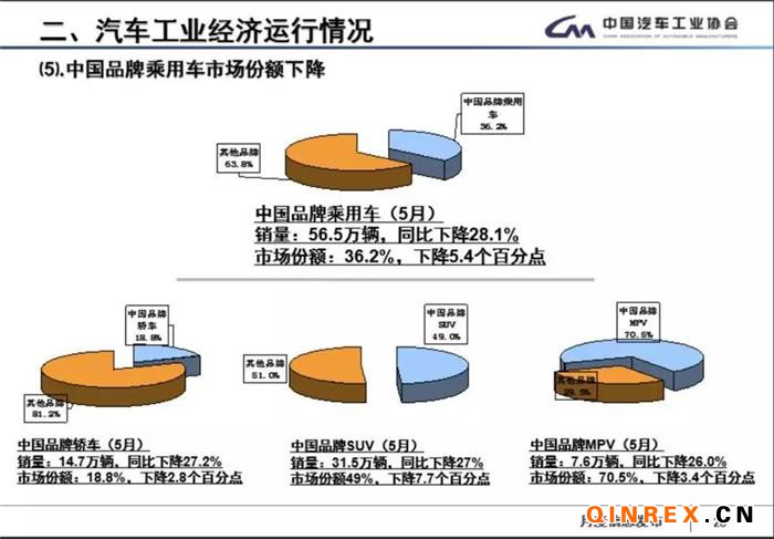 數(shù)據(jù)顯示,5月,自主品牌乘用車銷量為56.5萬輛,同比下降28.1%,市占率為36.2%,同比下降5.4%;1-5月,自主品牌乘用車銷量為333.5萬輛,同比下降23.4%,市占率為39.7%,同比下降4.2%。