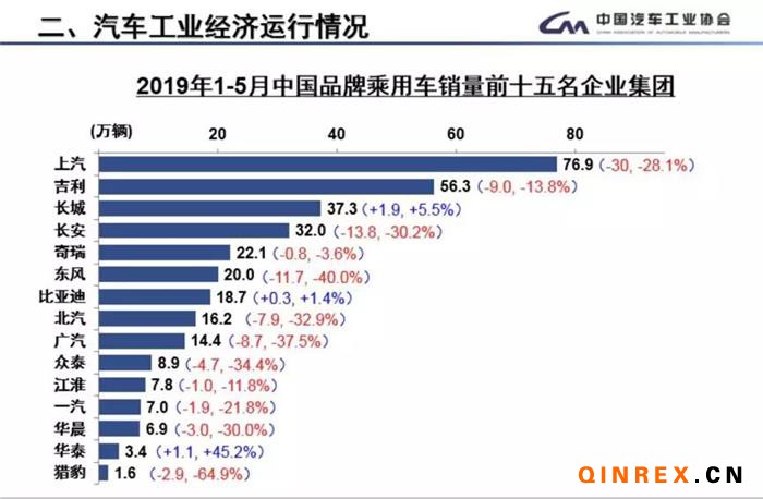 1-5月,汽車銷量排名前十位的企業(yè)依次是上汽、東風、一汽、北汽、廣汽、長安、吉利、長城、華晨和奇瑞。與上年同期相比,長城和華晨銷量小幅增長,其他企業(yè)均呈下降,長安和上汽降幅居前。