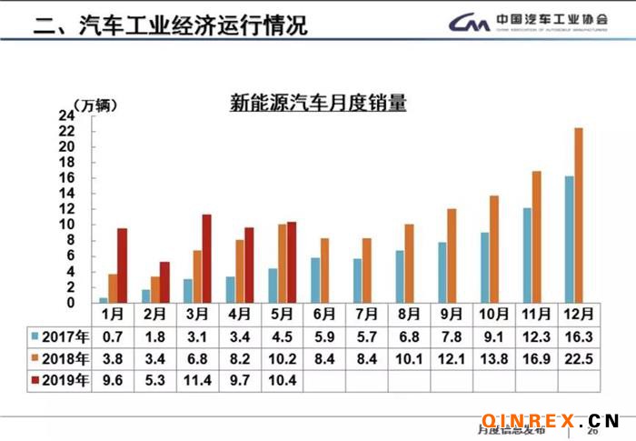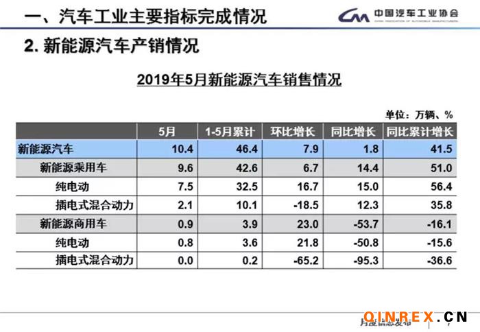 在車市寒冬中新能源汽車算得上是不多的亮點之一,但5月其增速也明顯放緩。5月,新能源銷量10.4萬輛,同比增長1.8%,環(huán)比增長7.9%。
