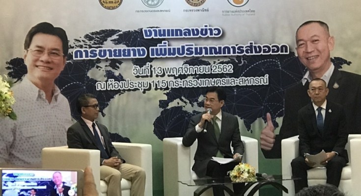 QinRex據泰媒11月13日報道,泰國國家副總理朱林以及農業部長查棱猜共同主持召開“橡膠銷售,增加橡膠出口”新聞發布會。