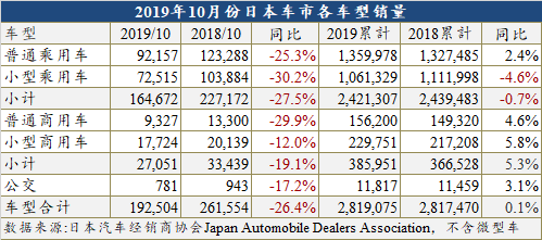 不但如此,10月的銷量也是近7年內日本車市的次低月銷量,僅高于2015年4月的319,480輛。其中,乘用車下跌25.1%至259,919輛,商用車下跌24.0%至314,798輛,皆創下這兩大細分市場近年內的新低。
