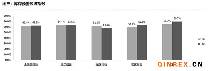 從區域指數情況看:調查顯示,11月份全國總指數為62.5%,北區指數為63.5%,東區指數為58.2%,南區指數為69.7%,西區指數為63.5%。