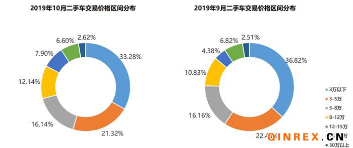 在交易價格方面,10月,二手車交易價格區間在3萬元以下的車輛市場占比最大,為33.28%,環比下降3.54%;30萬元以上價格區間的二手車交易市場占比最小,為2.62%,環比增長0.11%;10月份,除8-12萬、12-15萬和30萬以上價格區間的二手車交易量環比有所增長以外,其他價格區間交易量環比均有下降。