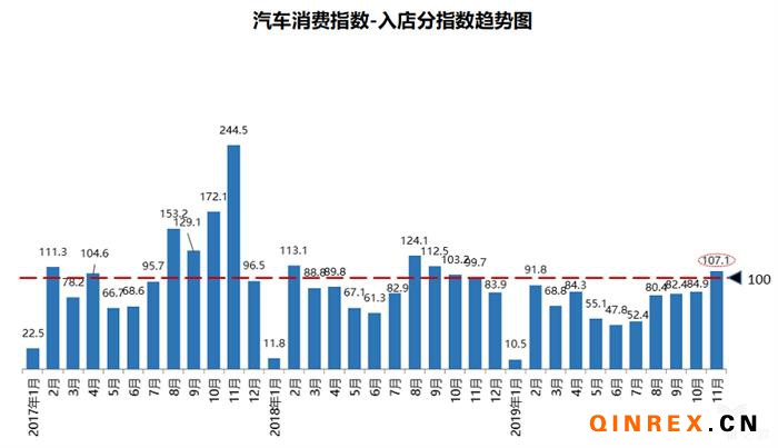 從構成汽車消費指數的分指數來看,2019年11月份需求分指數為101.8,較10月份上升,預計12月份消費者購車需求會有小幅上升;入店分指數為107.1,預計消費者在12月入店看車意愿提高;購買指數為109.7,預計12月份消費者實際購買意愿小幅上升。