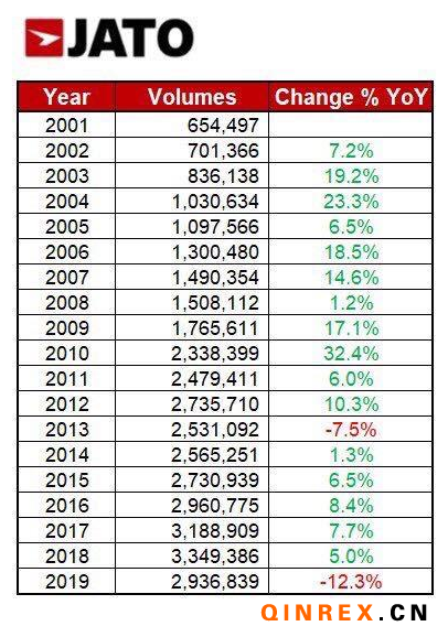 據(jù)印度汽車網(wǎng)站Autopunditz批發(fā)數(shù)據(jù)(不含豪華品牌),2019年印度乘用車總銷量為2,936,214輛,同比下跌12.4%,其中11月同比微跌0.5%至234,805輛。