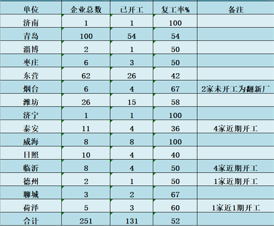 其中,輪胎企業集聚的青島市、東營市和濰坊市,復工率分別為54%、42%、58%。