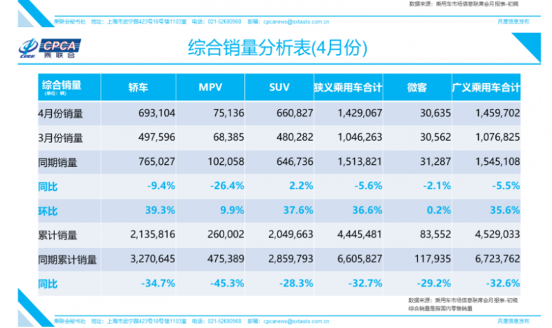 5月11日上午,乘聯(lián)會(huì)發(fā)布了4月份產(chǎn)銷數(shù)據(jù)。數(shù)據(jù)顯示,4月份乘用車市場(chǎng)整體復(fù)蘇明顯,狹義乘用車產(chǎn)量為152.15萬輛,同比下降5.6%;綜合銷量為142.91萬輛,同比下降5.6%;批發(fā)銷量為150萬輛,同比下降3.6%。與此同時(shí),4月狹義乘用車產(chǎn)銷量與3月份相比,環(huán)比均有30%以上的提升。