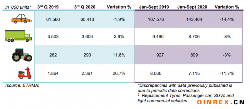 10月14日,歐洲輪胎和橡膠制造商協(xié)會(huì)(ETRMA)發(fā)布市場(chǎng)數(shù)據(jù)顯示,今年三季度歐洲替換胎市場(chǎng)的銷量較前兩個(gè)季度出現(xiàn)好轉(zhuǎn),除農(nóng)用車胎以外,所有類型輪胎的出貨量,環(huán)比均止降回升。但從前9個(gè)月來(lái)看,受疫情影響同比均下降,尤其是乘用車胎和摩托車/踏板車胎。