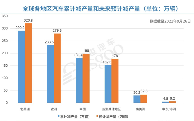 據外媒報道,根據AutoForecast Solutions(以下簡稱為AFS)的最新數據,截至9月26日,由于芯片短缺,全球汽車市場累計減產量已達893.4萬輛,比前一周增加了約57.6萬輛。其中,中國汽車市場累計減產量為181.4萬輛,占總減產量的20.3%。AFS預測,今年全球汽車產量損失可能會突破1,000萬大關。