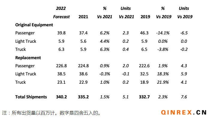 與2021年相比,乘用車、輕型卡車和卡車輪胎的原始設(shè)備(OE)出貨量預(yù)計將分別增長6.2%、4.4%和6.3%,總計增加290萬條;替換市場乘用車和卡車輪胎的出貨量預(yù)計也將分別增長0.9%和1%,而輕型卡車輪胎的出貨量則小幅下降0.3%。替換輪胎總預(yù)計量增加220萬條。