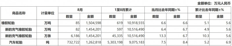 1-8月汽車輪胎出口量為530萬噸,同比增長5.2%;出口金額為908億元,同比增長6.9%。