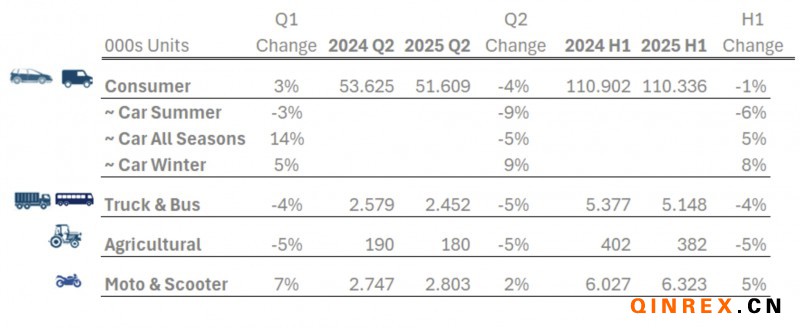 7月28日,歐洲輪胎和橡膠制造商協會(ETRMA)發布市場數據顯示,2025年二季度歐洲替換胎市場銷量同比下降3.5%至5704.4萬條。